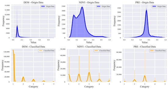 Gridded pixels were used as extraction units, linking the 14 indicators as independent variables and the EVI as the dependent variable. To manage data scale, continuous variables were discretized into five classes using the jenkspy library (Figure 4).