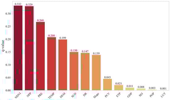 Geodetector identifies dominant drivers by quantifying spatial stratified heterogeneity via the q-statistic, assuming that influencing factors have significant spatial differentiation and linear additivity. It focuses primarily on spatially explicit relationships and linear effects. As a result, it may underestimate the influence of variables like LUT, whose ecological effects may be embedded in secondary responses of other indicators such as NPP and NDVI.