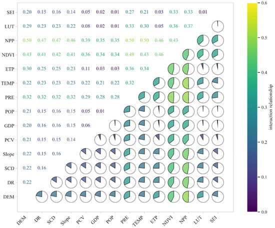 The Geodetector model was employed in conjunction with Python scripting to automate the analysis of large-scale spatial data and uncover the driving mechanisms of EVI spatial heterogeneity [39,40]. The model quantifies the independent and interactive effects of the 14 selected indicators on ecological vulnerability.