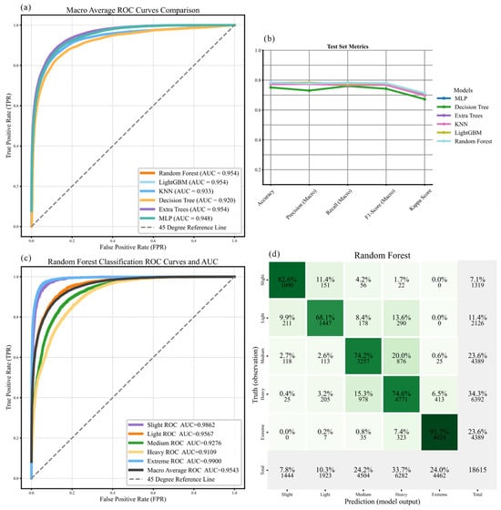 According to the macro-averaged ROC–AUC evaluation, ensemble learning models showed clear superiority in capturing nonlinear boundaries and high-order interactive effects in ecological vulnerability classification. RF, ET, and LightGBM all achieved an AUC value of 0.954, forming the top-performing tier and outperforming DT, KNN, and ANN (Figure 10a). Across conventional classification metrics, all models exhibited convergence, with macro-averaged accuracy, precision, recall, and F1-score ranging within 0.76 ± 0.02, reflecting the inherent complexity of vulnerability level classification. The Kappa coefficient (0.70 ± 0.02) further confirmed strong consistency between the predicted and actual classifications. Among all models, Random Forest performed best, achieving an F1-score and accuracy of 0.78, with a Kappa coefficient of 0.71, indicating substantial agreement (Figure 10b).