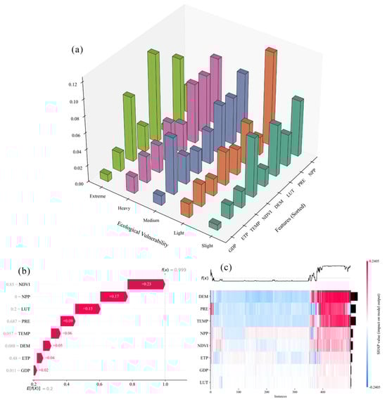 Analysis of the driving factors for ecological vulnerability based on SHAP: The global feature importance analysis (a); local SHAP waterfall plot for the first correctly predicted slightly vulnerable sample (b); SHAP heatmap for the extremely vulnerable class (c).