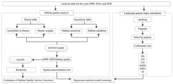 The InVEST model was employed to quantify the spatial distribution of quality of ecological habitats. The quality of ecological habitats index, serving as the dependent variable of the MGWR model, was calculated using InVEST for the years 2000, 2010, and 2020 to generate raster data. Taking a 500 m × 500 m grid as the unit, the average quality of ecological habitats of each grid was extracted as the response variable for MGWR, further revealing the scale dependency of landscape patterns on quality of ecological habitats. The research framework is illustrated in Figure 2: