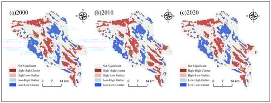 In order to better study the internal spatial clustering characteristics of quality of ecological habitats in Guanling County, it is necessary to conduct local spatial autocorrelation examination of the study area. By identifying hotspots (high-high clustering), coldspots (low-low clustering), and spatial outliers (high-low clustering and low-high clustering) [], the spatial distribution patterns of geographical phenomena in Guanling County can be studied (Figure 5). Among them, hotspots are mainly distributed in forestland and grassland areas, and the quality of ecological habitats shows a high-high clustering state; coldspots are mainly concentrated in cultivated land and construction areas, and the quality of ecological habitats shows a low-low clustering state. Overall, from 2000 to 2020, the quality of ecological habitats in Guanling County has a high degree of spatial clustering in forestland and grassland areas.