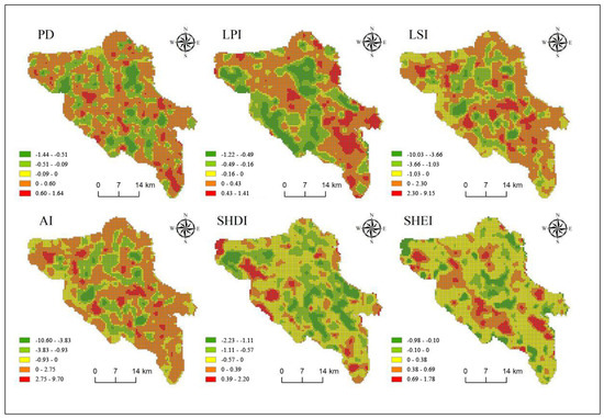 The MGWR model demonstrated high explanatory power (>89%), confirming the suitability of the selected influencing factors for modeling. Table 6 presents the descriptive statistics of the regression coefficients of the six landscape indices. The average and median values of the regression coefficients of PD, SHDI, and SHEI are close, and their impacts on quality of ecological habitats tend to be homogeneous spatially. The average and median values of the regression coefficients of LPI, LSI, and AI differ statistically significantly, and their impacts on quality of ecological habitats have strong heterogeneity spatially. The variation range of the regression coefficients of each landscape index is large, indicating that the differences in the direction and intensity of their spatial impacts are statistically significant, and their impacts on quality of ecological habitats have statistically significant spatial heterogeneity (Figure 7). The six landscape indices have positive or negative impacts on the quality of ecological habitats of different areas in the study area. Among them, PD, LPI, LSI, SHEI, and AI have positive impacts on quality of ecological habitats in the study area, accounting for 59.87%, 51.59%, 54.42%, 81.07%, and 59.14% of the total area, respectively. Among them, the positive impacts of PD and LPI are highly consistent with the distribution areas of forests, gradually weakening outward from the center, and the heterogeneity environment has a positive impact on the quality of ecological habitats of forests. While LSI and AI have different impacts on quality of ecological habitats in different land utilization types. The positive impact of SHEI is mainly concentrated in the cultivated land and grassland areas, indicating that the more balanced the landscape patches are, the more positive the impact on regional quality of ecological habitats is. SHDI has a negative impact on quality of ecological habitats as the main factor, accounting for 79.00% of the total area. Overall, landscape diversity has the greatest negative impact on the quality of ecological habitats of forest and grassland, gradually weakening outward from the center to the areas with forest and grassland, and has positive impacts on construction land and cultivated land, gradually weakening outward from the center. It indicates that the quality of ecological habitats in these areas is relatively higher, but decreases with the reduction of landscape diversity. The main reason for this phenomenon lies in the strong connectivity of ecological land such as forests and grasslands in Guanling Karst mountainous area. The fragmented and diverse landscape patterns to some extent will disrupt the connectivity of the ecosystem, and isolated ecological land is relatively fragile, with a greatly reduced ecological restoration capacity. Eventually, its ecological service functions are reduced. While construction land and cultivated land such as economic construction land are distributed relatively scattered under the influence of the spatial geography of the Karst mountainous area, isolated construction land and cultivated land are bound to be affected in economic development. However, they have great significance in stabilizing the environmental quality of regional species habitats and maintaining biodiversity.