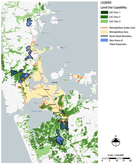 Map of HPL (LUC 1,2,3) in the proposed urban–rural boundary of Auckland. Source: Author’s own (2025) elaboration based on data from Manaaki Whenua–Landcare Research [28], Auckland Council [29], Silva [30], and Stats NZ [2].