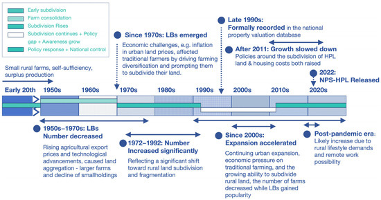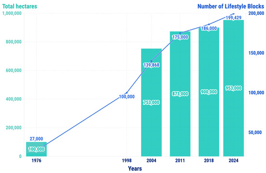 In the early 20th century, rural properties were typically small and aimed towards self-sufficiency, with surplus produce occasionally sold for income [5,15]. Rising agricultural export prices and technological advances during the 1950s to 1970s led to a doubling of rural land values and encouraged land aggregation, resulting in a decline in smaller properties as farming shifted toward larger, more efficient enterprises [5,38]. However, this trend reversed in the 1970s; the sustained inflation in urban land prices affected traditional farmers producing wool, meat, and dairy products, and forced farming diversification in response to the economic challenges, including prompting farmers to subdivide their land. At this time, smaller holdings began to emerge [5,15,19,38]; there were approximately 27,000 smallholdings covering nearly 100,000 hectares in 1976 [14,39]. Smallholdings started to increase significantly from that time on. (See Figure 3). McAloon [38] notes that between 1972 and 1992, the number of holdings below 40 hectares more than doubled, rising by over 130%, reflecting a significant shift toward rural land subdivision and fragmentation. Since the 1990s, due to continuing urban expansion, economic pressure on traditional farming, and the growing ability to subdivide rural land in response to social demand, the number of farms decreased while LBs gained in popularity [5,10,38].