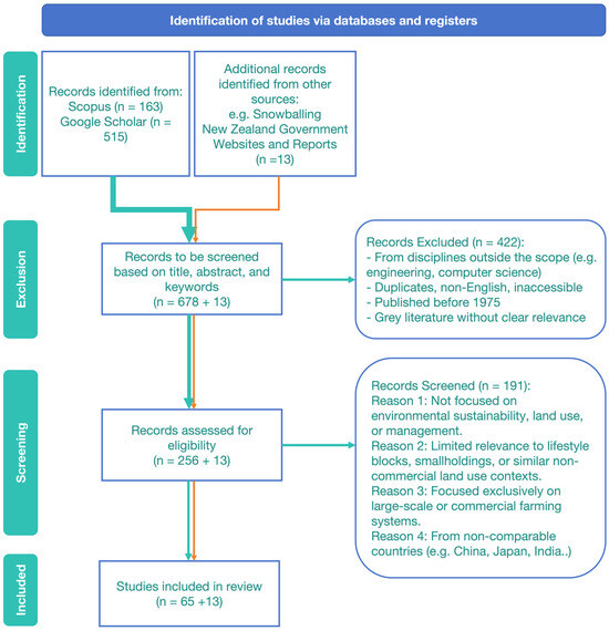 The exclusion criteria included the following: (a) studies unrelated to environmental sustainability or land management (e.g., studies in computer science or engineering), as well as (b) those based in countries with significantly different socio-economic and land use conditions compared to NZ (e.g., densely urbanized or high-intensity agricultural regions in countries such as China, Japan, or India). (c) Publications that focused solely on large-scale commercial agriculture or lacked relevance to small-scale, non-commercial land use settings (e.g., lifestyle blocks or smallholdings) were excluded. (d) Duplicate records, (e) inaccessible full texts, (f) grey literature without clear relevance, (g) non-English publications, and (h) publications prior to 1975 were removed from consideration.