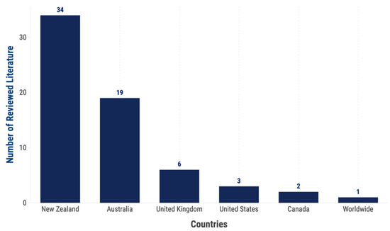 Distribution of reviewed literature by country. Source: Author (2025). Note: The 13 NZ policy documents were excluded to ensure consistency across peer-reviewed sources and avoid inflating NZ’s representation.