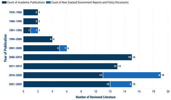 Distribution of reviewed literature by year. Source: Author (2025). Note: The chart includes both academic publications and New Zealand government reports and policy documents.