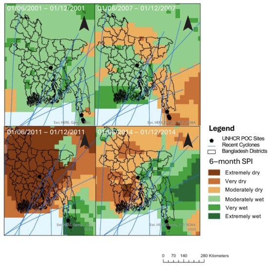 To analyze drought and flood conditions affecting refugee settlements, Standardized Precipitation Index (SPI) data, obtained from the National Oceanic and Atmospheric Administration (NOAA, Tables S1 and S2), were processed in ArcGIS Pro 3.4 to classify areas into drought-prone and flood-prone zones. UNHCR Persons of Concern (POC), sourced from UNHCR and government datasets, were overlaid onto the SPI raster to assess their exposure to these climatic extremes []. A spatial analysis was conducted to determine the proportion of refugee sites located in extreme drought or flood conditions.