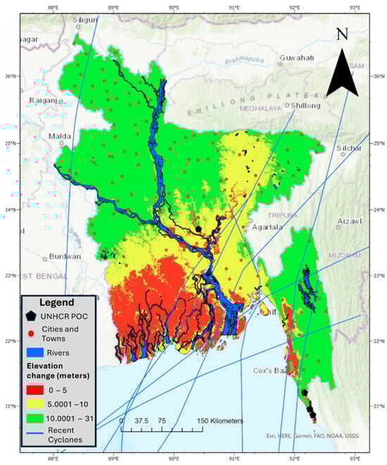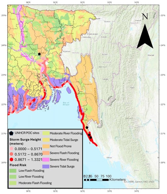 Using ArcGIS Pro 3.4 [], we evaluated the environmental vulnerability of Cox’s Bazar. Specifically, we performed a spatial analysis of Bangladesh consisting of three interrelated maps illustrating various climate vulnerabilities (Figure 1, Figure 2 and Figure 3) and determined the natural physical stressors. Each of the three maps specifically shows the international border of Bangladesh and the locations of Persons of Concern (POC), as documented by the UNHCR.