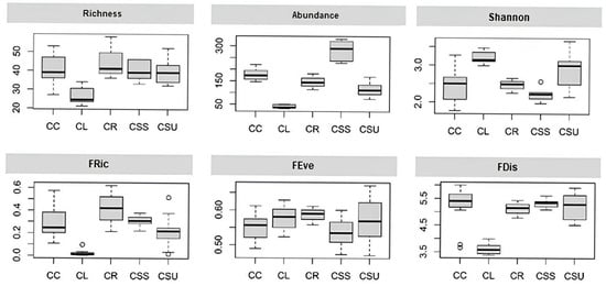 Distribution of data obtained for metrics of taxonomic (richness, abundance, and Shannon) and functional (FRic, FEve, and FDis) diversity among the five phytophysiognomies of Amazonian savannas: campo limpo (CL), campo sujo (CSU), cerrado rupestre (CR), campo cerrado (CC), and cerrado sensu stricto (CSS). The circles in the figure represent outliers, which are values that fall outside the range defined by the lower and upper quartiles.