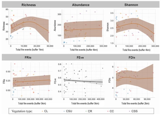 Responses of structural (abundance), taxonomic (richness and Shannon), and functional (FRic, FEve, and FDis) variables of Amazonian savannas to fire recurrence at different landscape scales. The solid lines represent the smoothed curves predicted by the fit of the best Generalized Additive Models (GAMMs), and the colored area around the solid line comprises the 95% confidence interval. The 43 sampling points were represented by circles, with different colors being assigned to each vegetation type (CL, CSU, CR, CC, and CSS) when these were considered as a random effect in the GAMM models.