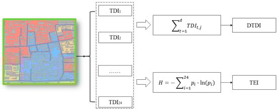This paper constructs an indicator system based on the business hours of the extracted land use grids, consisting of three indicators: the temporal diversity index (TDI), the daily temporal diversity index (DTDI), and the temporal entropy index (TEI) of the blocks, as illustrated in Figure 4.