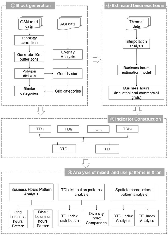 In order to realize the analysis of the spatio-temporal mixing pattern of land use in Xi’an, this paper proposes a land use mix evaluation framework consisting of three indexes, namely TDI, DTDI, and TEI, based on the AOI data, thermal data, and OSM road network data, and analyzes the analysis with Xi’an as the study area. The process of the proposed framework consists of four steps, which are shown in Figure 5, as follows. First, the AOI data were subjected to topology correction, buffer generation, and polygonal delineation steps to delineate the study area blocks and further divided the blocks into grids, and the AOI data were utilized to determine the functional type of the grids. Second, the grid operating hours are speculated based on thermal data and available AOI operating hours data. Third, TDI, DTDI, and TEI indicators were constructed in order to measure the spatio-temporal mixing patterns of land use and facilitate the evaluation of spatio-temporal mixing patterns of land use. Finally, using Xi’an City as the study area, a business hours pattern analysis, a land use temporal diversity analysis, and a spatio-temporal mixing pattern analysis were performed. In addition, the superiority of the indicator system in the mixed spatio-temporal measurement of land use is demonstrated by comparing it with the original measurement method.