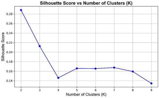 The K-means clustering algorithm is a widely employed technique in cluster analysis, particularly well-suited for studying population distribution patterns in time series data [29]. In this study, we apply the K-means clustering algorithm to normalize the number of active grids at each time point across the blocks in Xi’an and conduct a cluster analysis to investigate whether a consistent pattern exists in the business hours of these blocks. The clustering performance for different numbers of clusters is evaluated using the silhouette coefficient (Figure 8), and the results indicate that the clustering structure is relatively optimal when the number of clusters is set to two. Although the absolute values of the silhouette coefficients are relatively low—indicating a weakened clustering structure in the active time series of the grid cells in Xi’an—the selected number of clusters still effectively reveals the main patterns of block business hours and their variability.