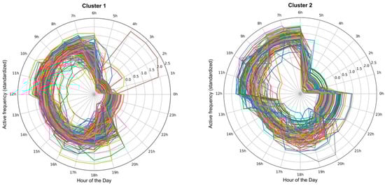 The results of the cluster analysis are shown in Figure 9. The pattern of hours of operation for the Xi’an block can be broadly divided into two categories. With the exception of a few special blocks, the activity levels of these two types of blocks show a similar trend over part of the day: higher activity from 6:00 to 12:00 and lower activity from 0:00 to 6:00. The difference is that Category 1 blocks have a high level of activity from 12:00 to 20:00, with activity decreasing significantly after 20:00. Category 2 blocks, on the other hand, maintain a more even and moderate level of activity from 12:00 to 24:00. The following morning may be associated with some of the business-type blocks with nocturnal activity.