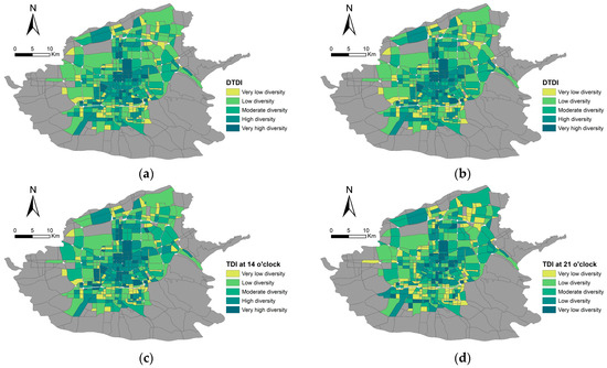 Distribution of temporal diversity index of blocks in Xi’an. (a) The DTDI; (b) TDI at 8:00; (c) TDI at 14:00; (d) TDI at 21:00. (Grey areas indicate regions with no data).