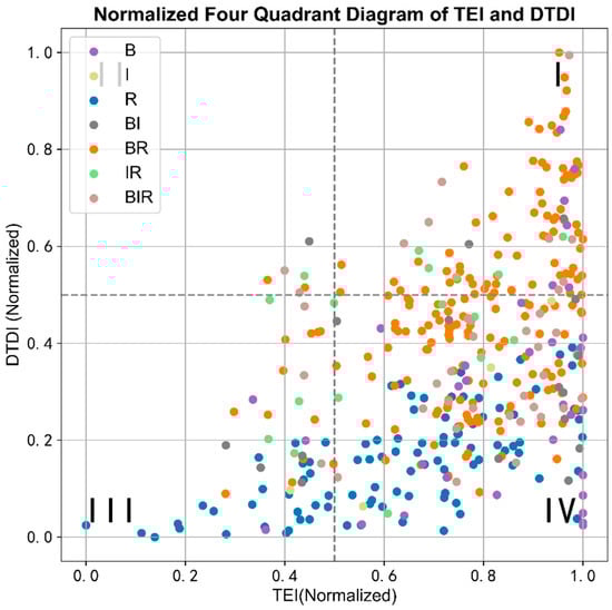 The pattern of the temporal diversity index for different block types in Xi’an can be portrayed by two indicators: the temporal entropy index (TEI) and the daily temporal diversity index (DTDI). We constructed TEIs for each block and combined them with their DTDIs to analyze the temporal diversity characteristics of the different blocks through binary scatter plots. As seen in Figure 11, the blocks can be categorized into four types based on the distribution of the DTDI and TEI values: