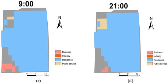 The following figures (Figure 13) illustrate the functional distribution characteristics of typical residential-dominated blocks in Quadrants III and IV at two distinct time points within a day: