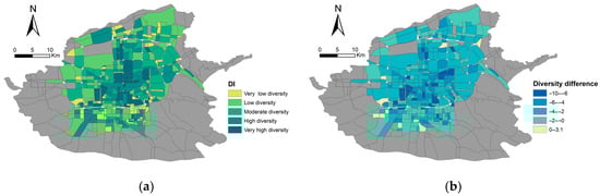 In order to explore the differences resulting from the inclusion of temporal availability in the diversity calculations, this study assumed that all functional types were open all day and calculated the raw diversity of the different blocks, which was subsequently compared to the daily temporal diversity index to generate a difference plot (Figure 14). As can be seen in Figure 14a, most of the blocks calculated through the traditional method had significantly higher diversity classes than their daily temporal diversity index classes. This result indicates a systematic overestimation of the diversity mix of land uses when temporal availability is not taken into account. This conclusion is further validated by the difference plots, which indicate the importance of the temporal dimension in diversity assessment, and that ignoring temporal availability may lead to a misjudgment of mixed land use diversity.
