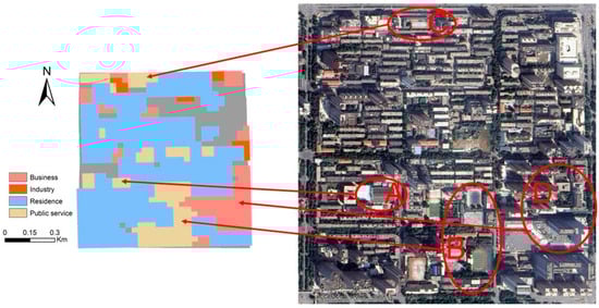 Functional distribution of block 267 and its corresponding remote sensing map of the real area. (A, B, C, and D indicate the selected case areas).