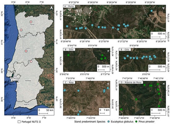 The areas used in this study are distributed across different regions of mainland Portugal (Figure 1). These areas correspond to forest stands of E. globulus and P. pinaster, spanning from north to south. E. globulus stands are located in three areas: Parque das Serras do Porto (Figure 1A) within the municipalities of Paredes and Valongo, in the northern region; Serra da Lousã, within the municipalities of Góis (Figure 1B), in the central region; and in the municipality of Nisa in the Alentejo, southern region (Figure 1C). The P. pinaster stands are also located in Serra da Lousã, within the municipalities of Góis and Castanheira de Pêra (Figure 1B) and Ribeira de Pena (Figure 1D), in the north of Portugal.