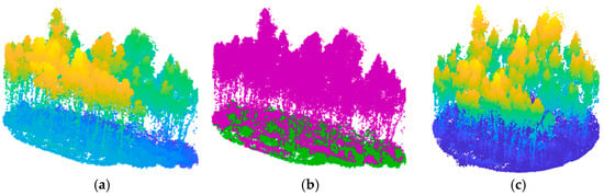 Terrain normalization process applied to a point cloud from one of the surveyed stands: (a) original point cloud; (b) classified ground points (green) and nonground points (purple); (c) normalized point cloud. Colors represent the altitude/height of each point.