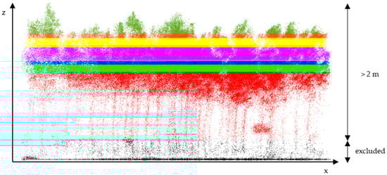 Height parameters are obtained by measuring the 25th, 40th, 50th, 75th, 90th, and 95th percentiles, along with the mean and maximum height, as illustrated in Figure 3. Structure parameters (crown density, projected crown area, and volume) were calculated using points located above 2 m (minimum value) and were computed for each percentile and mean height. Crown density represents the amount of the forest covered by the vertical projection of tree crowns [82], calculated as the proportion of vegetation points relative to the analyzed area. The projected crown area corresponds to the vertical projection of the tree crowns relative to the analyzed plot area and was normalized to hectare units. The volume, also converted to m3 ha−1, was estimated from the triangulated surface. Height dispersion was evaluated through variance, standard deviation, and range.