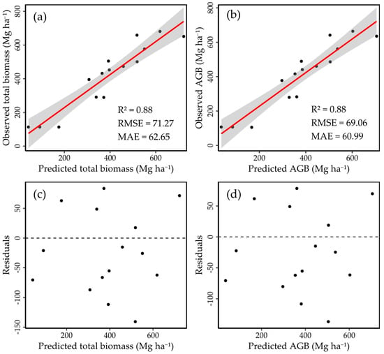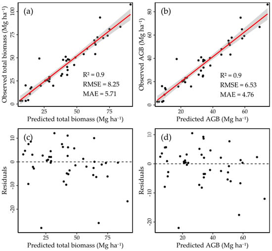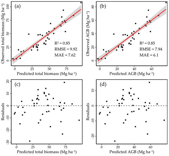 The final models provided an R2 of 0.89 for both AGB and TB, with an RMSE of 6.7 Mg ha−1 and 8.37 Mg ha−1 and a MAE of 5.36 Mg ha−1 and 6.69 Mg ha−1, respectively (Table 5).