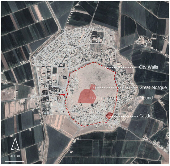 Main monumental structures and archaeological features within the historic core of Harran, including the city walls (approximate surface area of the historic walled core: 111 hectares), Great Mosque, ancient mound, and castle. The only remining gate (Halep Gate) is represented with the red arrow.