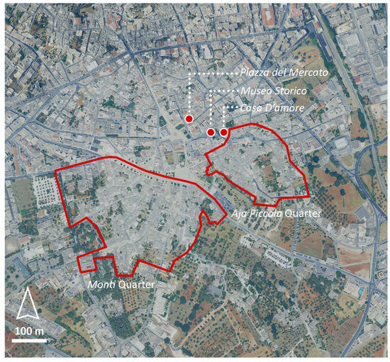Main heritage quarters and landmark sites within the historic core of Alberobello. The map highlights the two UNESCO-protected districts: Monti Quarter (7.8 ha) and Aja Piccola Quarter (2.4 ha). Key historical landmarks (Casa D’Amore, Piazza del Mercato, and Museo Storico) are also indicated, reflecting the officially recognized cultural components of the site “The Trulli of Alberobello” added to the UNESCO World Heritage List in 1996. Elaborated by the author based on the maps provided by UNESCO [42].
