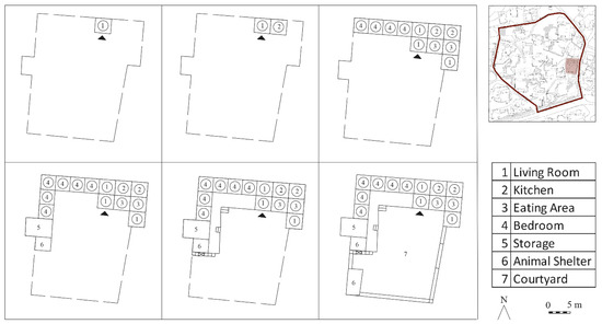 As shown in Figure 4, the first unit is typically a living room (1), functioning as the main family space and occasionally shared with animals during cold seasons. As needs grow, additional units are added; a kitchen (2), often used in colder months as a warm sitting area, and a modest eating area (3) are introduced next. Over time, specialized bedrooms (4) are included, reflecting increasing spatial differentiation as family life becomes more crowded after marriage [45].