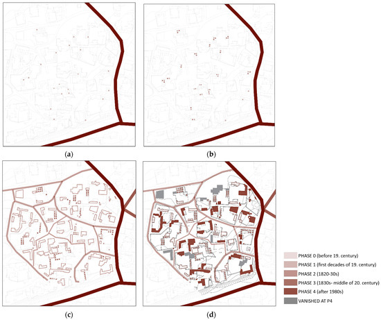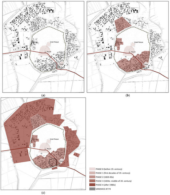 The identification of development phases was based on a set of morphological criteria, including changes in aggregation patterns, spatial arrangement (e.g., the emergence of courtyards), construction typologies, and functional differentiation. These criteria were interpreted through diachronic comparisons of historical maps and satellite imagery available in different years, and they were further cross-referenced with oral histories and the academic literature, where feasible. The triangulation of visual analysis, archival sources, and local testimonies provided a coherent interpretative framework. Although qualitative in nature, this multi-source validation approach ensured consistency in delineating expansion phases and helped mitigate subjectivity in assigning temporal boundaries.
