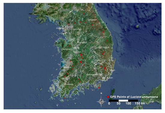 The most commonly encountered fireflies in South Korea are Luciola lateralis, Lychnuris rufa, and Luciola unmunsana; conservation studies have mainly focused on Luciola lateralis and Lychnuris rufa [8]. Of these, Luciola unmunsana is endemic to South Korea [9] and is difficult to collect because of its lack of inner wings and low mobility in females [6,10]; therefore, there is a relative lack of research on its distribution and restoration compared to other firefly species in South Korea.