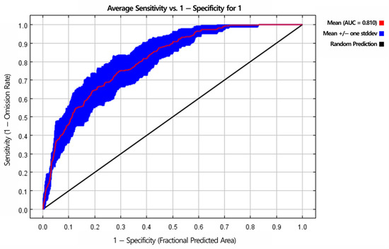 In general, when constructing models using MaxEnt 3.4.4, model performance can only be assessed using the AUC. Accordingly, previous studies [17,18,19,35,36] have also relied solely on the AUC for evaluating the predictive accuracy of MaxEnt models. Therefore, in this study, we assessed the prediction accuracy of the MaxEnt model for potential habitat mapping using AUC validation (Figure 2).