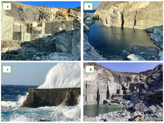 In the northern part of the island, near Koumela village (Figure 4), there is the Koumela quarry, one of the most characteristic quarries of green Tinian marble (ophite stone). This imposing quarry, hidden at the bottom of a natural cove, is known for the layers of greenish marble that meet the sea water. In fact, its landscape has been used as a backdrop for musical and theatrical performances because of its imposing and unique beauty.