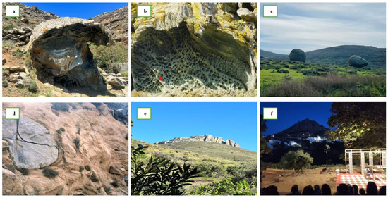 (a) Tafoni; (b) alveoles; (c) tors in Volax; (d) core stones; (e) Exombourgo; (f) evening theater performance with the view of Exombourgo’s plutonite.
