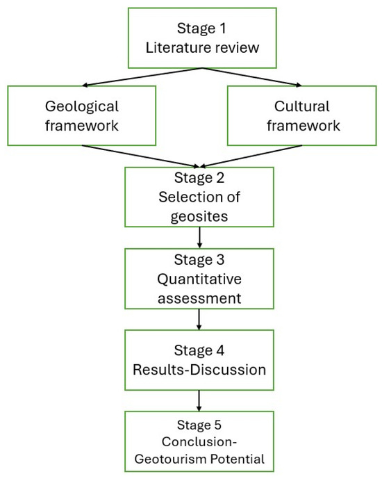 For the present study, the following methodology was adopted, as illustrated in the flowchart (Figure 7). Initially, a comprehensive literature review was conducted, followed by a detailed geological study of the area. In parallel, the cultural characteristics of the region were examined to establish a holistic understanding of its geocultural landscape. In the next phase, a selection of geosites was carried out based on their geological, educational, and cultural relevance. These geosites were then subjected to a structured quantitative evaluation. Subsequently, the results were analyzed and discussed to identify key strengths and limitations. The study concludes with a synthesis of findings, emphasizing the significant geotouristic potential of the Tinos Island geosites.
