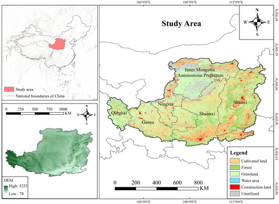 As can be seen from Table 6, the area of cultivated land and grassland area decreased by 5211.25 km2 and 1240.5 km2, respectively, from 2010 to 2020, while the area of construction land increased by 4807.75 km2, which is in line with the urban development law in recent ten years. During the early 2010s, the unrestrained expansion of urban areas, accompanied by a massive shift of rural populations to cities, led to a sharp increase in construction land, resulting in significant encroachment on cultivated land and grassland. Concurrently, due to the unique importance of the Yellow River and its severe ecological challenges, the implementation of converting cropland to forest and grassland to combat soil erosion and desertification further reduced the area of cultivated land.