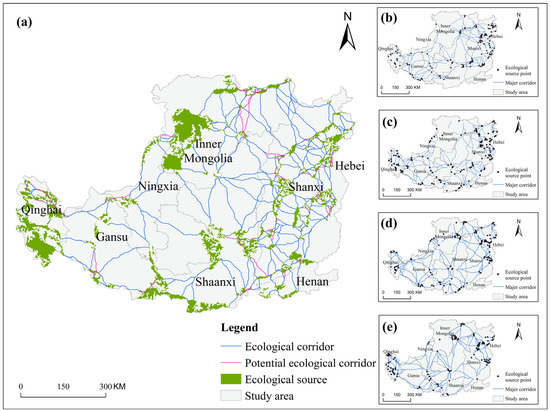The ecological network under the different scenarios ((a–e) are 2020, the natural development scenario, the ecological protection scenario, the urban development scenario, and the cultivated-land protection scenario, respectively).