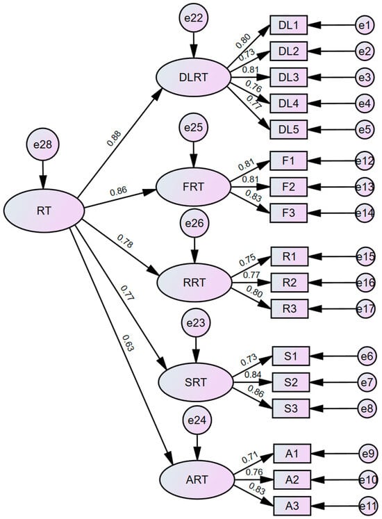 This article examines CFCTRT through five dimensions: DLRT, FRT, RRT, SRT, and ART, thereby necessitating a confirmatory second-order factor analysis. As indicated in Table 6, the correlation coefficients among these five dimensions range from 0.45 to 0.77, signifying moderate to high correlation. Each dimension includes at least three observed variables, fulfilling the prerequisites for executing a second-order model confirmatory factor analysis []. Thereafter, the path analysis of the tolerance second-order model, presented in Table 7, reveals that the standardized loadings of each first-order factor on the second-order factor range from 0.628 to 0.883, all statistically significant at the p < 0.001 level, indicating a robust relationship between the second-order factor and the first-order factors. Table 8 showcases the goodness-of-fit indices for the second-order model specific to the CFCTRT second-order confirmatory factor analysis. Based on the values suggested for the fit [], it can be found that the model fits well. Utilizing the standardized factor loadings, the CR of the second-order factor is determined to be 0.89, with an AVE of 0.62, reflecting sound reliability and validity. Consequently, the structure of the tolerance second-order model is affirmed as reasonable. RT, representing a second-order factor, encompasses DLRT, SRT, ART, FRT, and RRT as first-order factors, thus confirming Hypothesis 1. The outcomes of the second-order model are illustrated in Figure 2. The path coefficients between RT and its five dimensions reveal the influence order as follows: DLRT (0.88), FRT (0.86), RRT (0.78), SRT (0.77), and ART (0.63), indicating that daily life and financial factors primarily influence residents’ tolerance.
