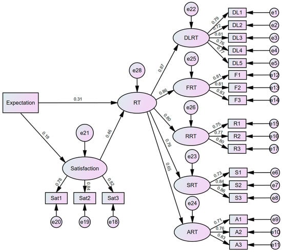 This study utilizes Structural Equation Modeling (SEM) to examine the relationships among residents’ expectations, satisfaction, and tolerance in the context of CFC reformation. Additionally, it explores the mediating role of satisfaction between residents’ expectations and tolerance. The SEM analysis and fit index computations were performed using AMOS 26 software. The model fit was determined by various fit indices, including the Chi-Square, Root Mean Square Error of Approximation (RMSEA), Incremental Fit Index (IFI), Tucker–Lewis Index (TLI), and Normed Fit Index (NFI). As shown in Table 9, all the aforementioned fit indices met the fitting standards, indicating that the model fits well and the constructed structural equation model is ideal. The overall model is illustrated in Figure 3.