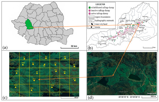 Figure 1. Location of the study area: (a) administrative map of Romania highlighting Hunedoara County; (b) map of the Valea Jiului coal basin showing the locations of spoil heaps; (c) Google Earth aerial view of the Defor Petrila tailings dump with a grid overlay; (d) map of the Defor Petrila tailings dump with the 17 sampling points.