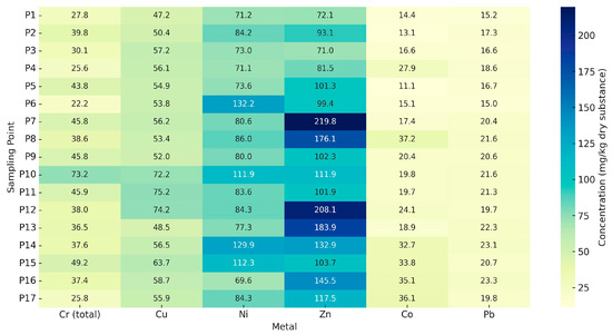 Among the pollutants studied, Zn exhibits the highest concentrations, reaching up to 219.8 mg kg−1 dry matter in sample P7, as well as showing elevated levels in P14 (208.1 mg kg−1 dry matter), P13 (183.9 mg kg−1 dry matter), and P8 (176.1 mg kg−1 dry matter). These high values may indicate point-source pollution or increased mobility of Zn within the local soil. The accumulation of Zn in the central area of the dump may relate to the drainage direction or the distribution of the mining waste.