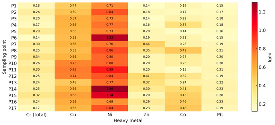 For the other heavy metals, the Igeo values are generally below unity, reflecting low contamination. Cr (total), Pb, and Zn show values between 0.14 and 0.35, indicating non-pollution or negligible contamination. Co exhibits increased values at P7 (0.49) and P17 (0.48), suggesting localised accumulation without exceeding critical risk thresholds.