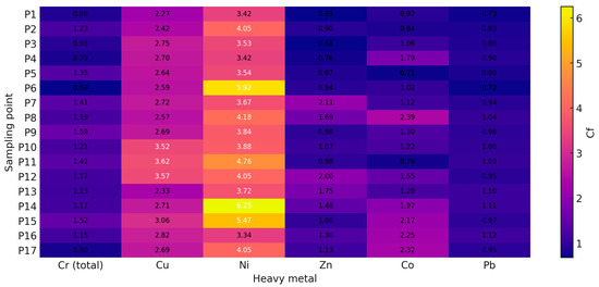 Ni also shows elevated concentrations in P6 (132.2 mg kg−1 dry matter), P14 (129.9 mg kg−1 dry matter), and P15 (112.3 mg kg−1 dry matter), exceeding the alert thresholds for non-agricultural soils under Romanian legislation (Ord. 756/1997). These findings align with the high contamination factor (Cf) values observed for Ni at these points (see Figure 5), supporting significant contamination by this metal.