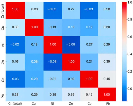 The positive correlations of Co–Pb (r = 0.45) and Zn–Pb (r = 0.39) parallel geochemical associations reported by [47] in Chinese smelting areas. The weak correlations among Cr, Ni, and other metals suggest distinct adsorption mechanisms, as similarly noted by [48] in arid tailings.