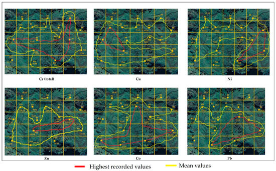 In managing soil pollution by heavy metals, an essential component is understanding the spatial distributions of these contaminants [34]. The concentration-contour method is an effective cartographic and analytical tool that allows for the visualisation and interpretation of variations in heavy-metal concentrations over large land areas [35].