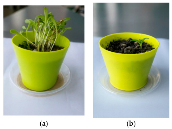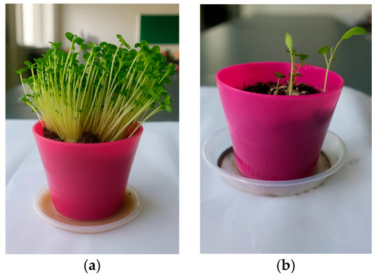 Figure 11. Mustard (Brassica spp.) plant development under different soil conditions: (a) seedlings grown in contaminated soil; (b) seedlings grown in commercial control soil.